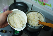 먼저 밥하면서 생긴 쌀뜨물을 뚝배기에 담고 불을 켭니다.